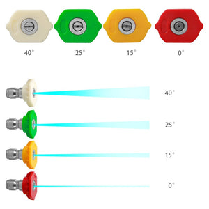 Alle Düsen sind farblich deutlich gekennzeichnet, um Verwechselungen zu vermeiden und können sowohl direkt an Pistolen mit Schnellkupplung (QC) eingesetzt werden, als auch in unterschiedlichen Lanzen.
